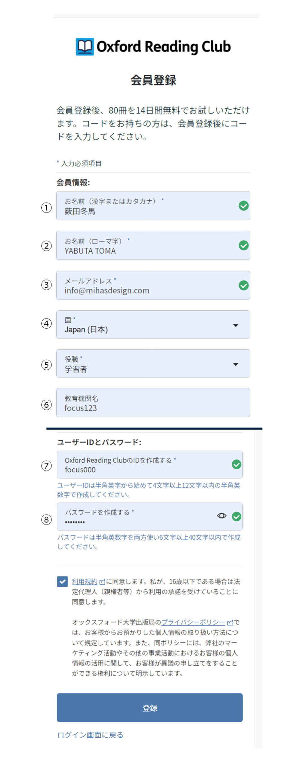 ⑤:学習者 ⑥:Focus123 ⑦ ID: 別途案内します。②パスワードは各自決めて、入力して下さい。